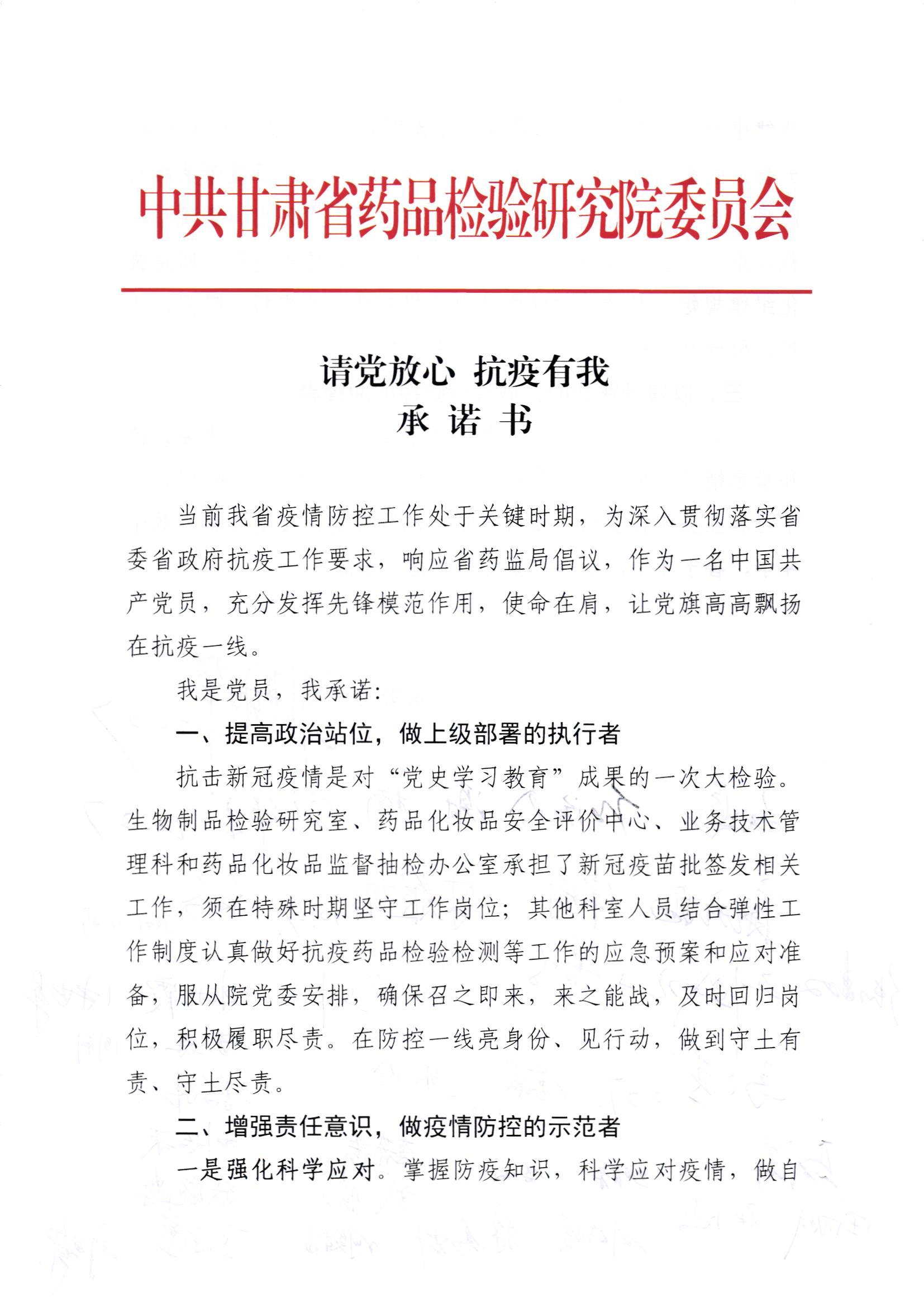 “服从院党委安排,确保召之即来,来之能战,做到守土有责、守土尽责”。处于抗击新冠疫情关键时期,我院党委积极响应省药监局倡议,组织全体党员庄严承诺。