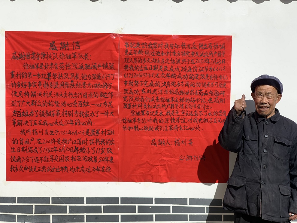 徐继军植根群众,以高度负责的使命,用智慧与知性,推动脱贫攻坚工作,特别是他用我院帮扶经费为四社维修便民桥,解决村民涉水出行的事迹得到了广大群众的称赞;还有为村民杨刘喜成功修改了20年未修改成功的年龄,让70岁的老人能够正常享受国家政策的事,解决了压在杨刘喜心头近20年的心病,为了表示感谢,老人家亲笔为徐书记写了感谢信,送到了村委、县委、省药检院和省药监局,他还说要感谢徐继军的父母,感谢他们生了这么优秀的儿子,感谢院领导培养了这么好的干部,让他在重要的岗位有更多的机会造福百姓。贫困地区孩子的教育是压在徐书记心头的一件大事,他在入户的时候经常给家长讲,教育扶贫和教育脱贫是最有力的脱贫方法之一,让贫困地区的孩子接受良好的教育,也是扶贫开发的重要任务,是阻断贫困代际传递的重要途径。村上有厌学的孩子,他就多次入户去给孩子做思想工作,最后在他的循循教导下,孩子重新踏入了学校,顺利完成了学业。他多次强调一定要咬牙供孩子上学,让孩子走出农门,不要让贫困地区的孩子输在起跑线上,要让他们都有受教育的机会,有上大学的机会,让知识改变他们的命运。徐继军书记就是这样一位在平凡的扶贫岗位上,心系百姓,服务百姓,一心为民,默默地温暖着张寨村,成为村民企盼的好书记、好干部。