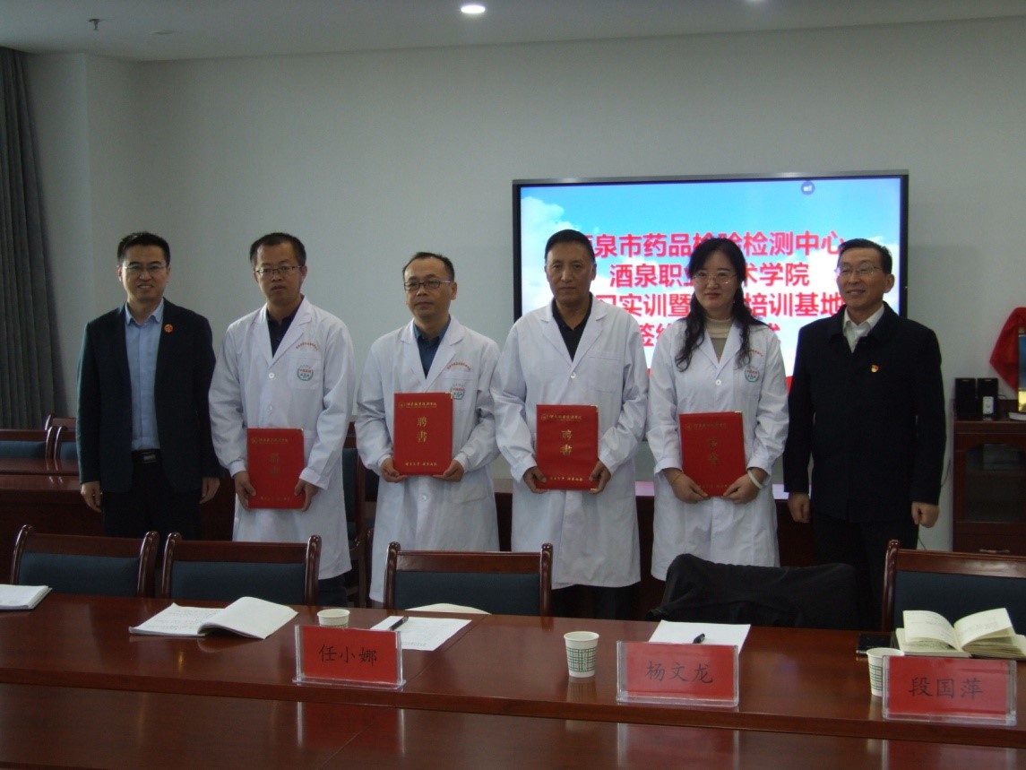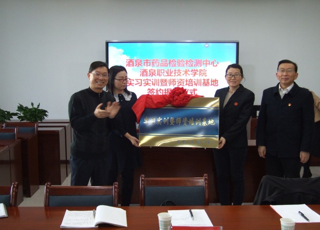 仪式上,中心主任郭华荣与易志军校长签署《酒泉市药品检验检测中心酒泉职业技术学院实习实训暨师资培训基地协议》,并共同为“实习实训暨师资培训基地”揭牌。