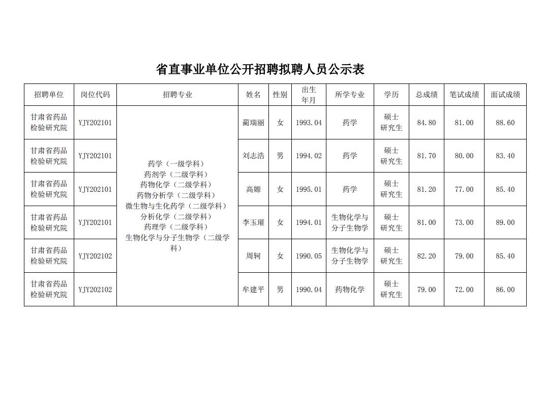 根据《甘肃省药品检验研究院关于2021年公开招聘的公告》,甘肃省药品检验研究院计划招聘专业技术人员6人,经报名、资格审查、考试、体检和考察,择优确定拟聘对象6人,现将拟聘对象予以公示,欢迎社会各界监督。对拟聘人员存在的影响聘用公正的问题,请来电如实反映,我们将认真查实,确保公平公正。